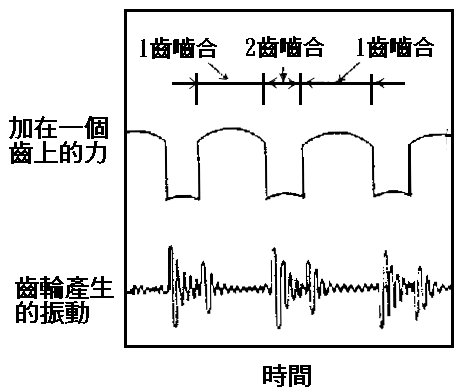 由此圖可知,從兩齒嚙合變?yōu)橐积X嚙合的瞬間,和從一齒嚙合變?yōu)閮升X嚙合的瞬間,分別在一齒嚙合及兩齒嚙合的狀態(tài)發(fā)生齒輪對(duì)的自然振動(dòng)(衝擊振動(dòng)),但通常以后者的振動(dòng)較大。